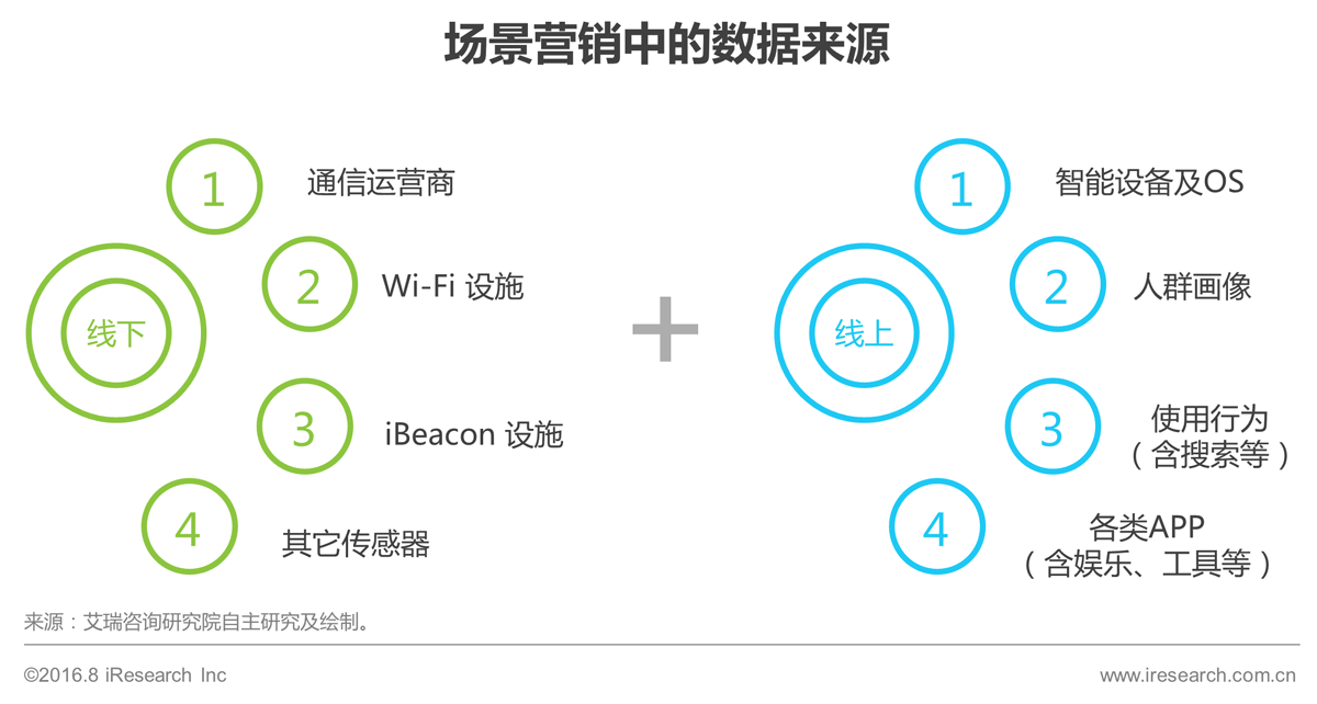 场景营销中实现广告的_և场景化投放,很大E度上依赖于数据的真实、多l以及结构化。相较于传统|络营销Q场景营销中数据来源更Z富,可分Z大类别:1Q线下来源,如通信q营商、Wi-Fi设施、iBeacon设施和其它传感器{;2Q线上来源,如智能设备、智能OS、h画像、用行为和各类APP{?/P>