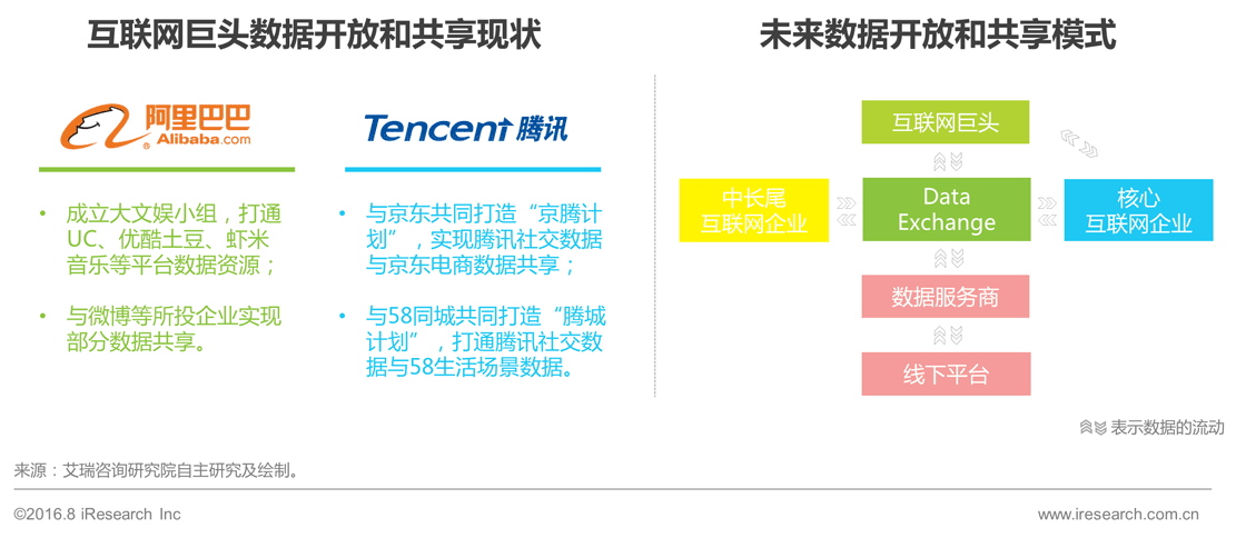 1Q互联网巨头凭借完善的账号体系和全面的业务覆盖Q拥有着最Z富的U上数据Q线上数据的开攑ְ首先在互联网巨头与各自核心伙伴之间展开Q经q脱敏处理的非核心数据,也有可能向营销服务商等营销产业链上下游有限制地开放;2Q中及长尾q_的数据将通过相对独立的Data ExchangeQ第三方数据交易q_Q实现共享,DataExchangeh一定的成长I间Q?Q线下数据的开放也逐步具备条gQ由于线下^台缺数据处理能力,围绕着U下数据的利用和׃n生一Ҏ据服务商?/P>