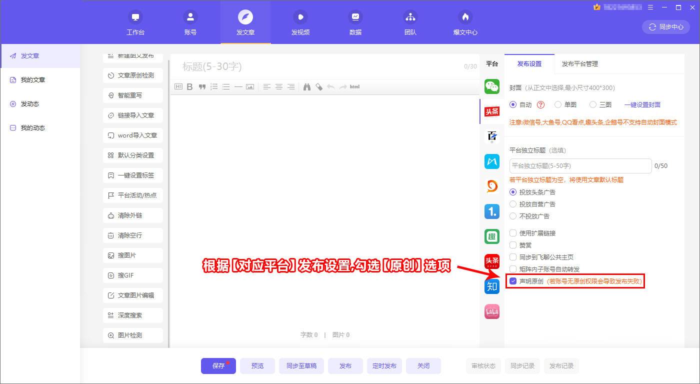 W一U:针对q_讄原创Q通过【发布】页面对应【^台设|】区域,Ҏ(gu)对应q_Q找到设|原创选项【勾选】即可;